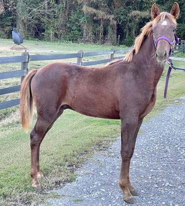 Born 4-13-2020: Chestnut filly out of a direct Undertaker mare. The stallion is The Virginia Coal-Miner by Rowdy Rawhide. She is 3 quarters standardbred.