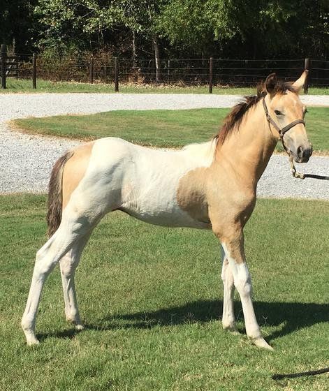 This buckskin and white tobiano stud colt is out of my stallion Coal Miner (direct son of Rowdy Rawhide) and a mare who is a direct daughter of The Black Night Shade (2007 WGC TWH). These babies have the best of both worlds, the Standardbred speed and the TWH smooth, gentle gait and temperament. This boy has WGC bloodlines on both side which means he will be gentle but have a big motor.